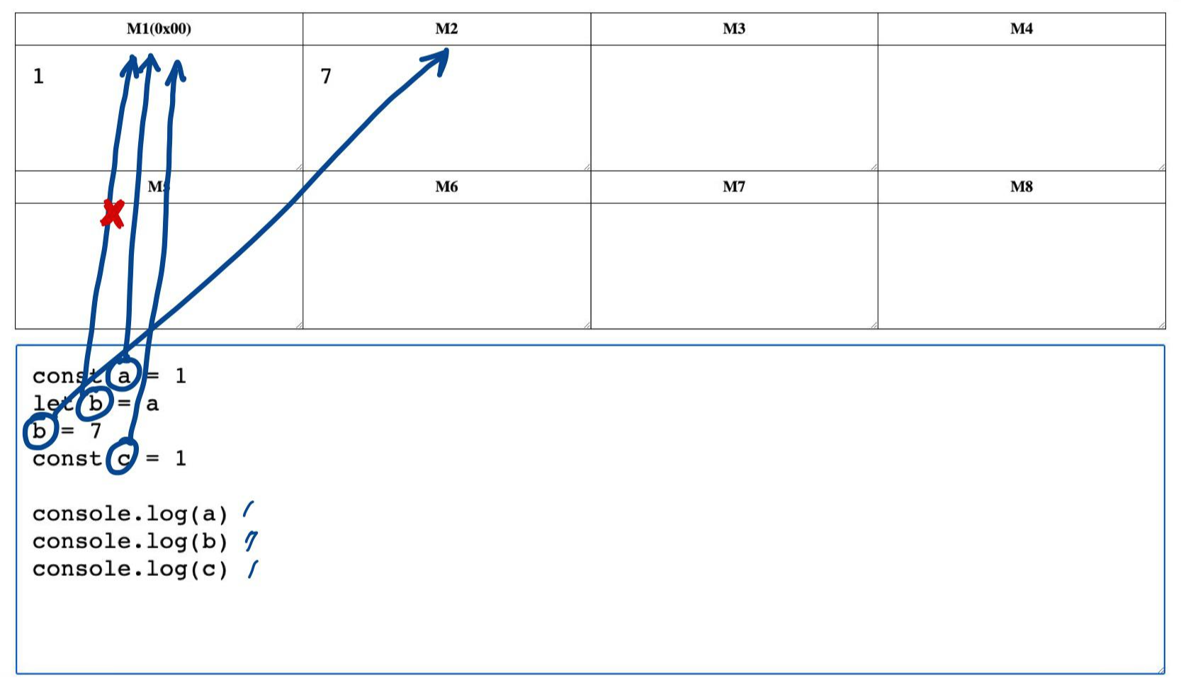 - Immutable data type: 값이 변경될 수 없는 데이터 타입 i.e.) const keyword를 사용한 변수
