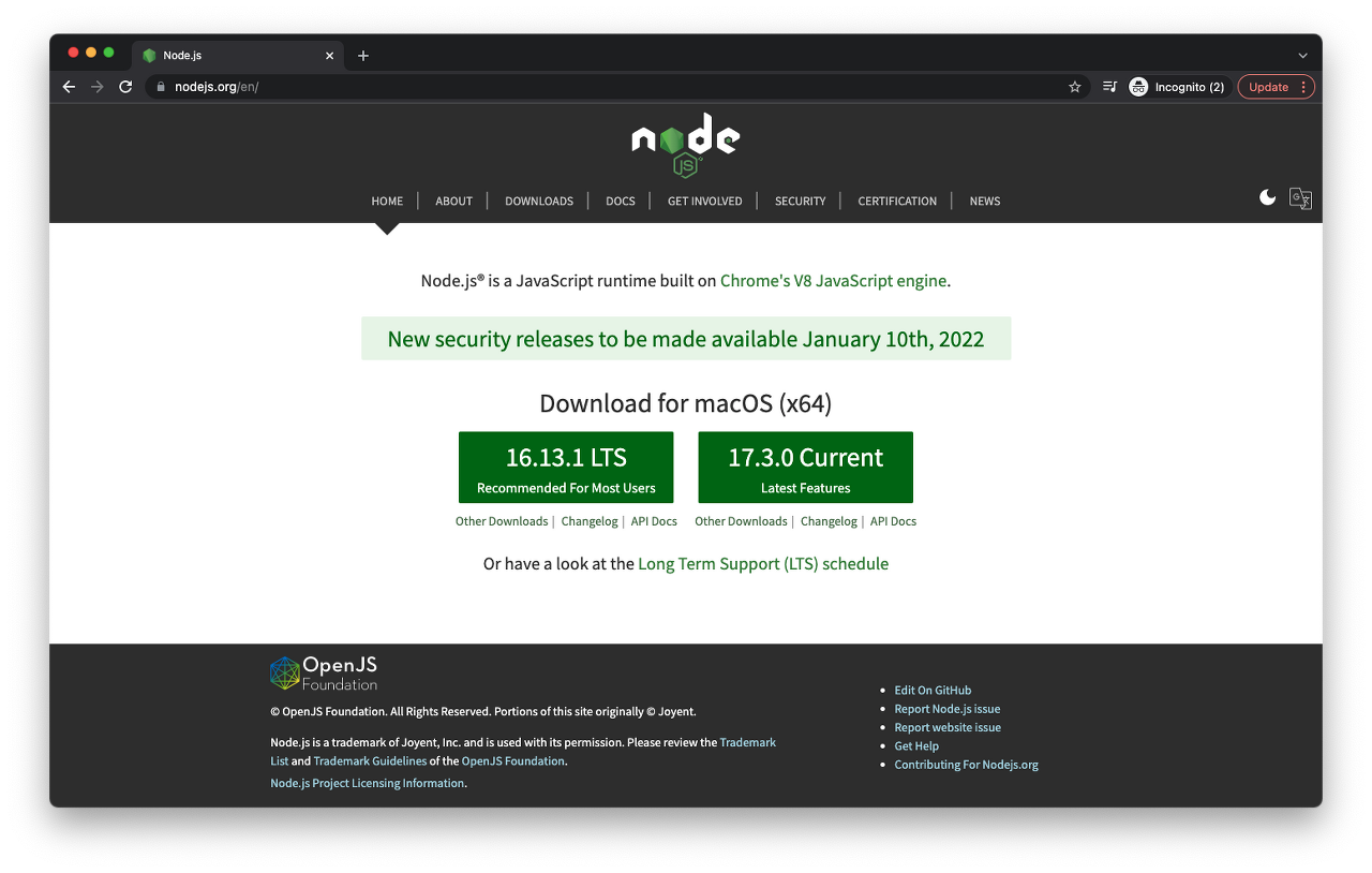일반적으로 자바스크립트는 브라우저에서 동작한다. Node.js는 자바스크립트를 브라우저 외부에서 사용할 수 있게하는 자바스크립트가 동작하는 런타임 환경을 말한다. Node.js를 이용하면 자바스크립트로 서버를 구현할 수도 있다. 리액트에서 직접적으로 Node.js를 쓰지는 않지만 리액트 프로젝트를 만들때 필요한 도구들이 Node.js를 사용한다. (i.e. 바벨, 웹팩)