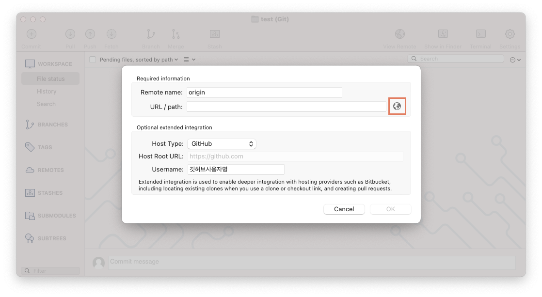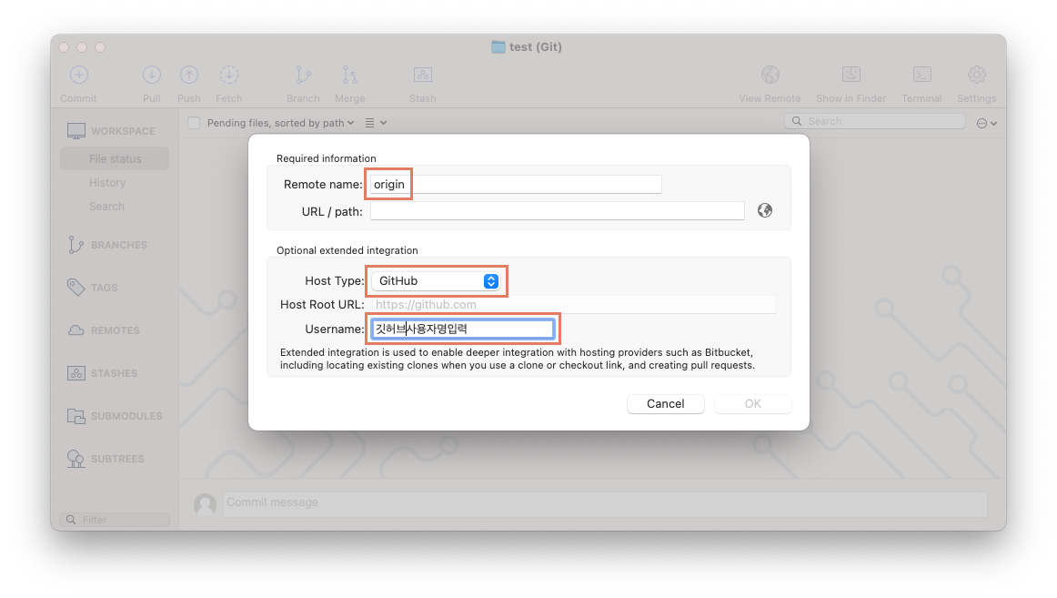3. 원격이름 origin, 호스트 종류 GitHub, 깃허브 사용자명 입력하기
