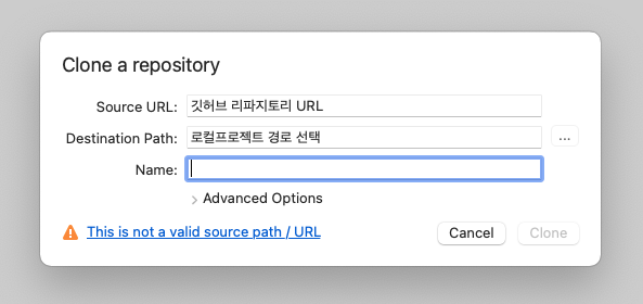 2. Source URL에는 깃허브 리파지토리 URL을, Destination Path에는 클론한 프로젝트를 놓을 경로를 입력한다. 그리고 Name은 폴더이름에 따라 자동생성된다.