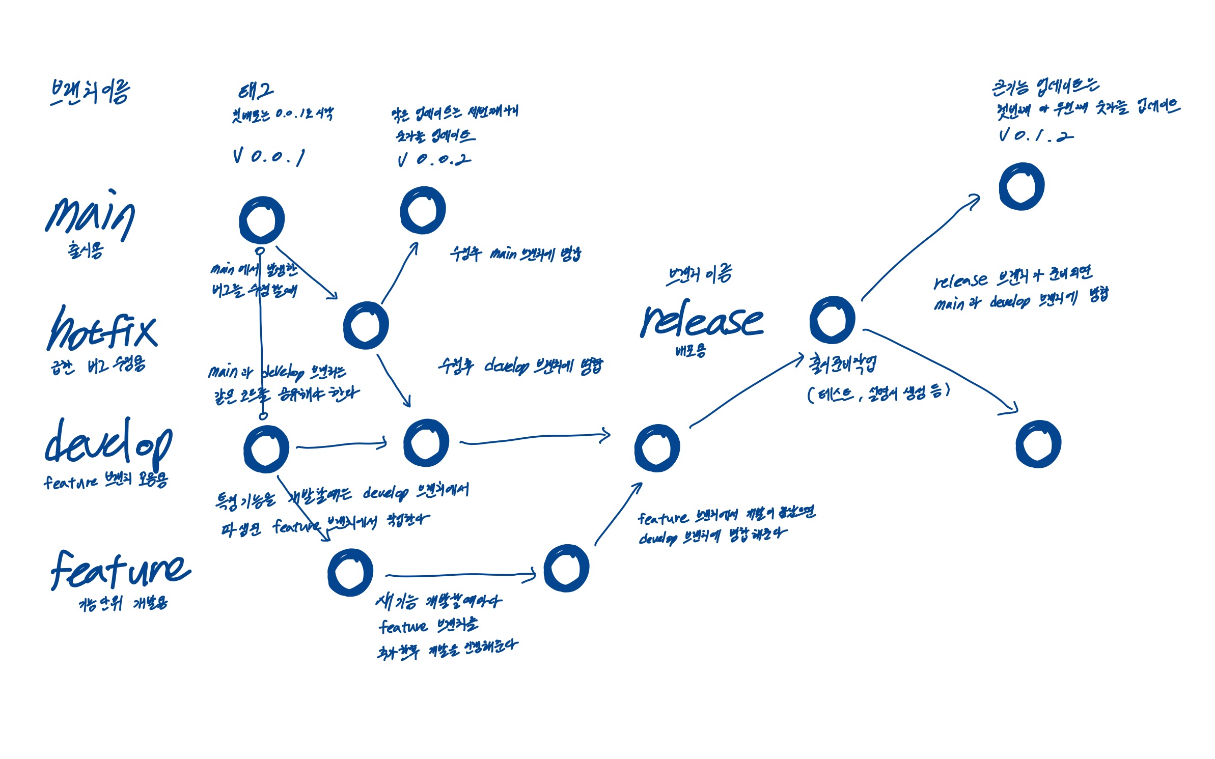 main 브랜치와 develop 브랜치는 계속 유지가 되는 브랜치로 두개의 브랜치는 항상 같은 코드를 공유하고 있어야한다.