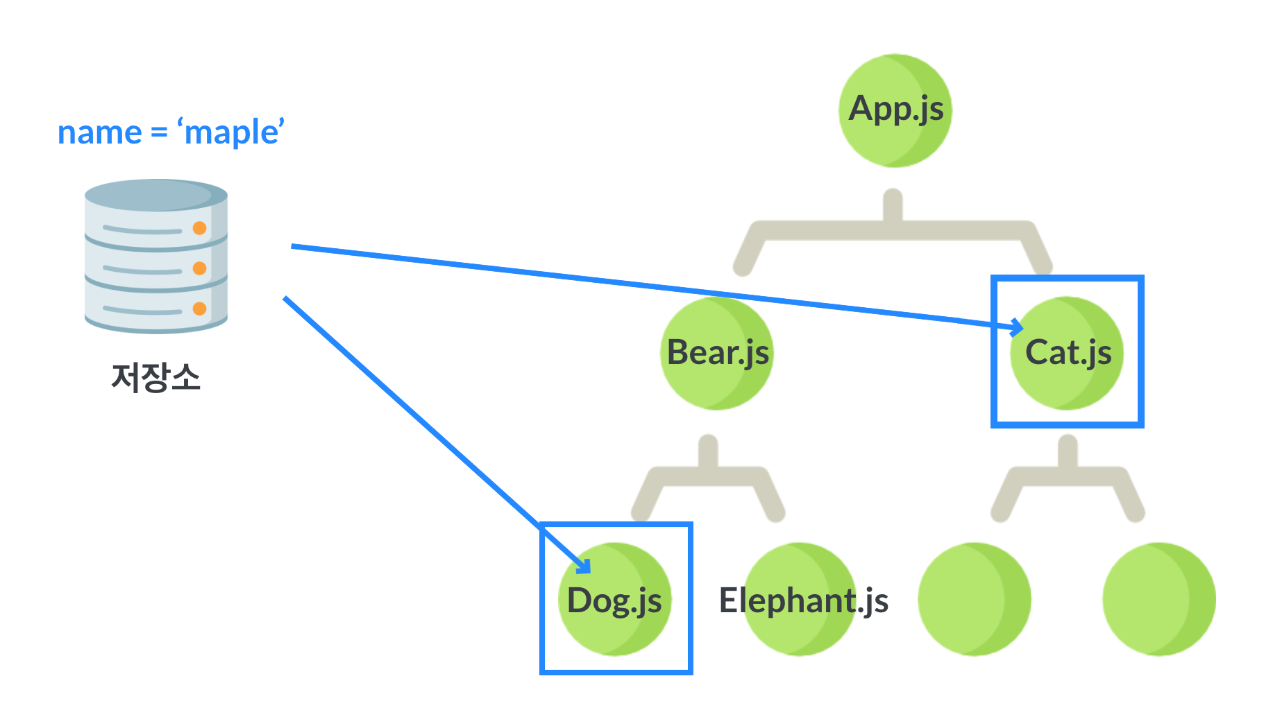 2. 컴포넌트 Cat, Dog가 해당 데이터를 참조한다 (저장소에서 데이터를 참조하는 것을 "구독한다"라고도 표현한다)
